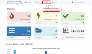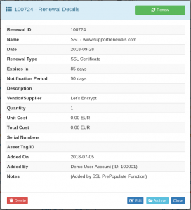 You can easily add your SSL Certificate renewals under your Support Renewals account. What’s more, you don’t even need to go searching for the vendor or expiry details, we can do that for you! Follow the simple steps below to add an SSL Certificate renewal. When you’ve added the SSL cert renewal, we’ll keep an eye on it and we’ll check to see if the expiry details have changed before sending out notifications for it. Plus, if it has changed, we’ll update the renewal, so the next time you look at it you’ll see the renewal history!
