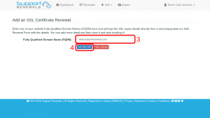 - On the “Add an SSL Certificate Renewal” screen, enter the fully qualified domain name (3) for the certificate you wish to track and click the “Get SSL Info” button (4).