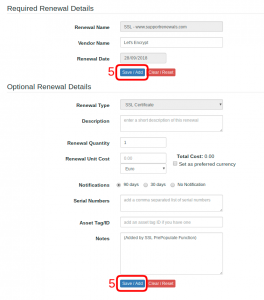 - In the background, we will head out to the internet and gather some details about your SSL certificate for you and fill the renewal form for you, as shown below. At this time, you can simply choose to “Save/Add” (5) the renewal details now or you can add more detailed info if you wish (such as cost, description, etc). Once ready, click the “Save/Add” button (5).