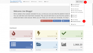 - When logged into your Support Renewals account, from any page, click on the User menu (1) and select “Company Accounts” (2).