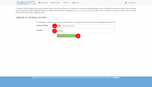- This will bring you to the “Upgrade to Company Account” page. Here you need to enter your company name (1) and select the main operating country for your company (2). Click on the “Upgrade to Company Account” button (3) when ready.