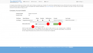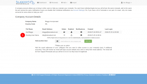 - Now on the “Company Account Details” page, you can see the “Company Name” and “Location” details (1) and your user account details listed also (2). Plus, you can see the area for adding a new company user (3) and if you wish to make them an admin or not (4). Admin acess allows them to add users, force password resets, change user notifications, add/remove admin access and delete users.
