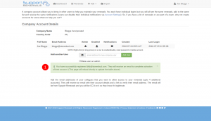 - When the user has been added a notice appears (1) informing you that the account completion request has been email to the user, with your CC’d on it, so they know it is legitimate. The page will refresh after a few seonds.